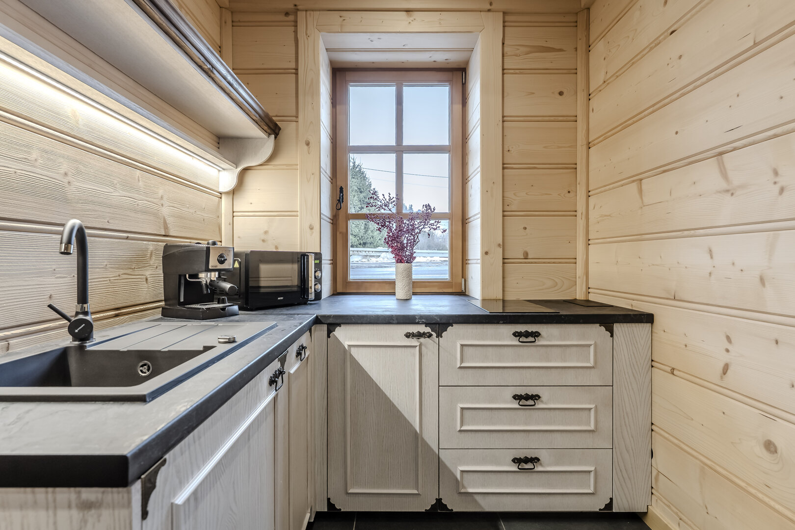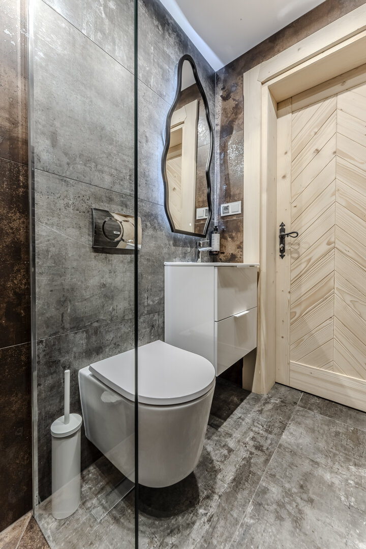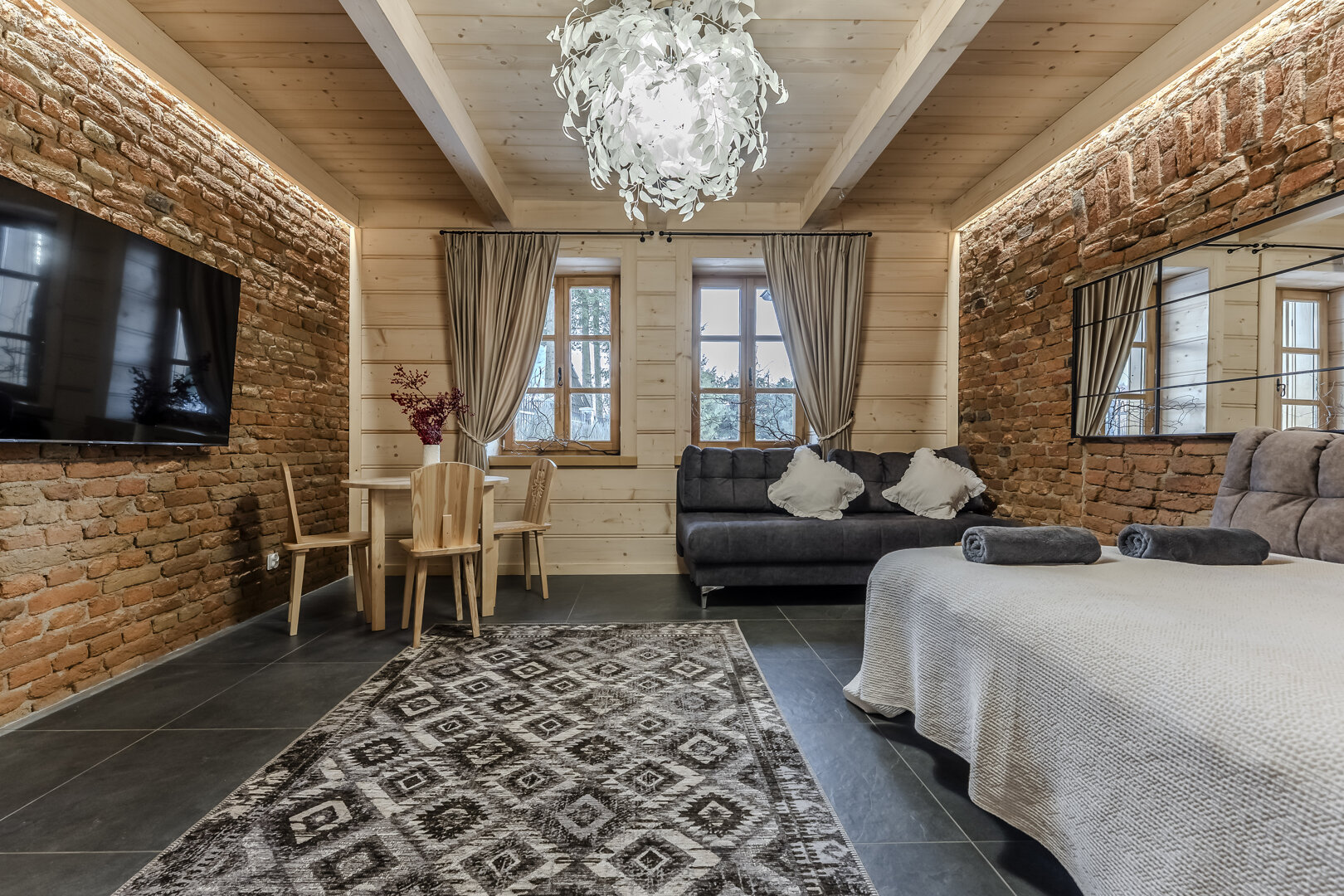 Apartament oferuje prywatną łazienkę z nowoczesną kabiną prysznicową, w pełni wyposażony aneks kuchenny z lodówką, płytą indukcyjną, czajnikiem, kompletem przyborów kuchennych oraz zmywarką. W części wypoczynkowej znajdują się dwie wygodne, rozkładane sofy
